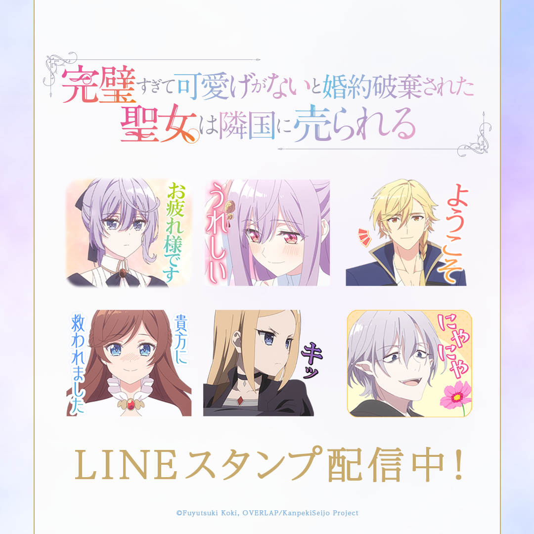 TVアニメ『完璧すぎて可愛げがないと婚約破棄された聖女は隣国に売られる』初となるLINEスタンプがインクルーズより配信開始!是非、LINEスタンプでもTVアニメ『完璧すぎて可愛げがないと婚約破棄された聖女は隣国に売られる』の世界観をお楽しみください。