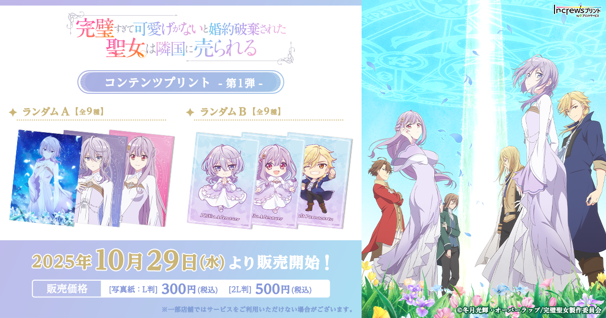 株式会社インクルーズ(東京都渋谷区、代表取締役社長 山﨑 健司)は、10月29日(水)より、日本全国のコンビニエンスストアを中心とするマルチコピー機内で気軽にプリントできる「インクルーズプリント by eプリントサービス」にて、TVアニメ『完璧すぎて可愛げがないと婚約破棄された聖女は隣国に売られる』のコンテンツプリント第1弾がランダム式で販売開始したことをご報告させていただきます。