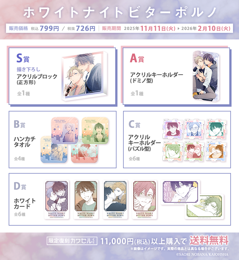 株式会社インクルーズ(東京都渋谷区、代表取締役社長 山﨑 健司)が企画・運営するフィジカルグッズのオンラインくじ「カワセルくじ 乙女部」にて、11月11日(火)より、「ホワイトナイトビターポルノ」のくじの【復刻再販】が開始となりました事をご報告させていただきます。