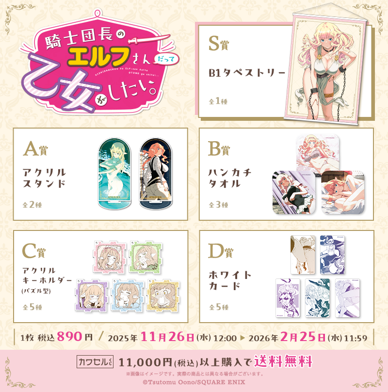 株式会社インクルーズ(東京都渋谷区、代表取締役社長 山﨑 健司)が企画・運営するフィジカルグッズのオンラインくじ「カワセルくじ」にて、11月26日(水)より、「騎士団長のエルフさんだって乙女がしたい。」のくじが販売開始になりましたことをご報告させていただきます。