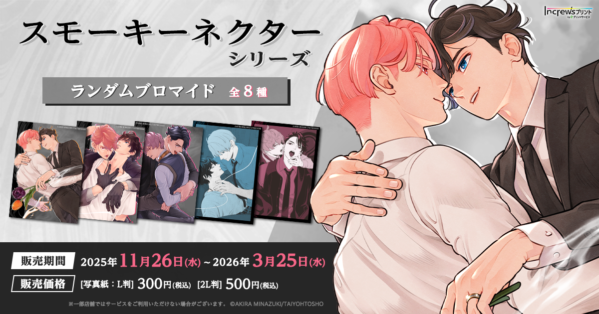 ミナヅキアキラ先生の「スモーキーネクターシリーズ」のランダムブロマイドが、日本全国のコンビニエンスストアを中心とした約38,000店舗のマルチコピー機で一斉に販売開始!