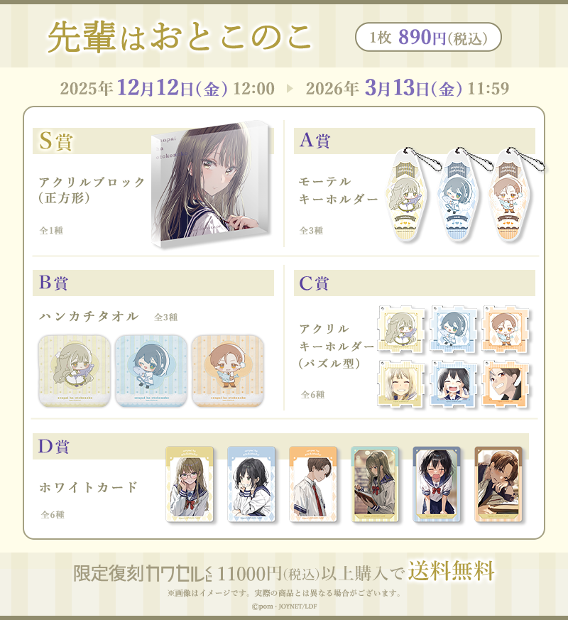 株式会社インクルーズ(東京都渋谷区、代表取締役社長 山﨑 健司)が企画・運営するフィジカルグッズのオンラインくじ「カワセルくじ」にて、12月12日(金)より、『先輩はおとこのこ』のくじの【復刻再販】が開始となりました事をご報告させていただきます。
