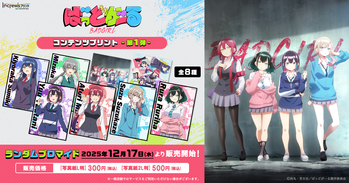株式会社インクルーズ(東京都渋谷区、代表取締役社長 山﨑 健司)は、12月17日(水)より、日本全国のコンビニエンスストアを中心とするマルチコピー機内で気軽にプリントできる「インクルーズプリント by eプリントサービス」にて、TVアニメ『ばっどがーる』のコンテンツプリント第1弾がランダム式で販売開始したことをご報告させていただきます。