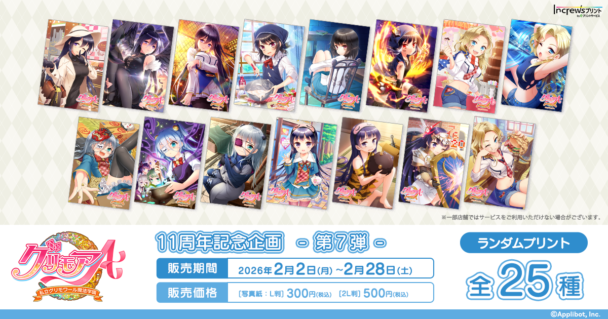 株式会社インクルーズ(東京都渋谷区、代表取締役社長 山﨑 健司)は、2月2日(月)より、日本全国のコンビニエンスストアを中心とするマルチコピー機内で気軽にプリントできる「インクルーズプリント by eプリントサービス」にて「グリモアA ~私立グリモワール魔法学園~」11周年を記念したコンテンツプリントの第7弾がランダム式で販売開始したことをご報告させていただきます。