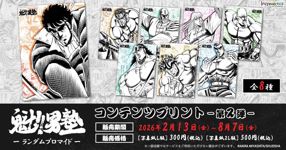 株式会社インクルーズ(東京都渋谷区、代表取締役社長 山﨑 健司)は、2月13日(金)より、日本全国のコンビニエンスストアを中心とするマルチコピー機内で気軽にプリントできる「インクルーズプリント by eプリントサービス」にて『魁!!男塾』のイラストを使用したランダムブロマイド第2弾が販売開始したことをご報告させていただきます。