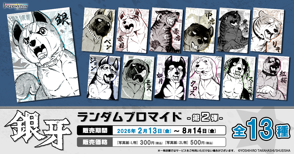 株式会社インクルーズ(東京都渋谷区、代表取締役社長 山﨑 健司)は、2月13日(金)より、日本全国のコンビニエンスストアを中心とするマルチコピー機内で気軽にプリントできる「インクルーズプリント by eプリントサービス」にて「銀牙 -流れ星 銀-」のイラストを使用したランダムブロマイド第2弾が販売開始したことをご報告させていただきます。