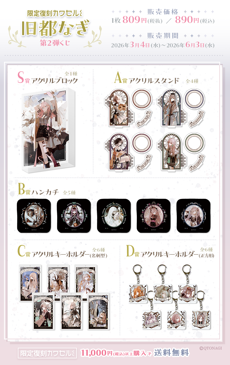 株式会社インクルーズ(東京都渋谷区、代表取締役社長 山﨑 健司)が企画・運営するフィジカルグッズのオンラインくじ「カワセルくじ」にて、3月4日(水)より、「旧都なぎ 第2弾」のくじの【復刻再販】が開始となりました事をご報告させていただきます。