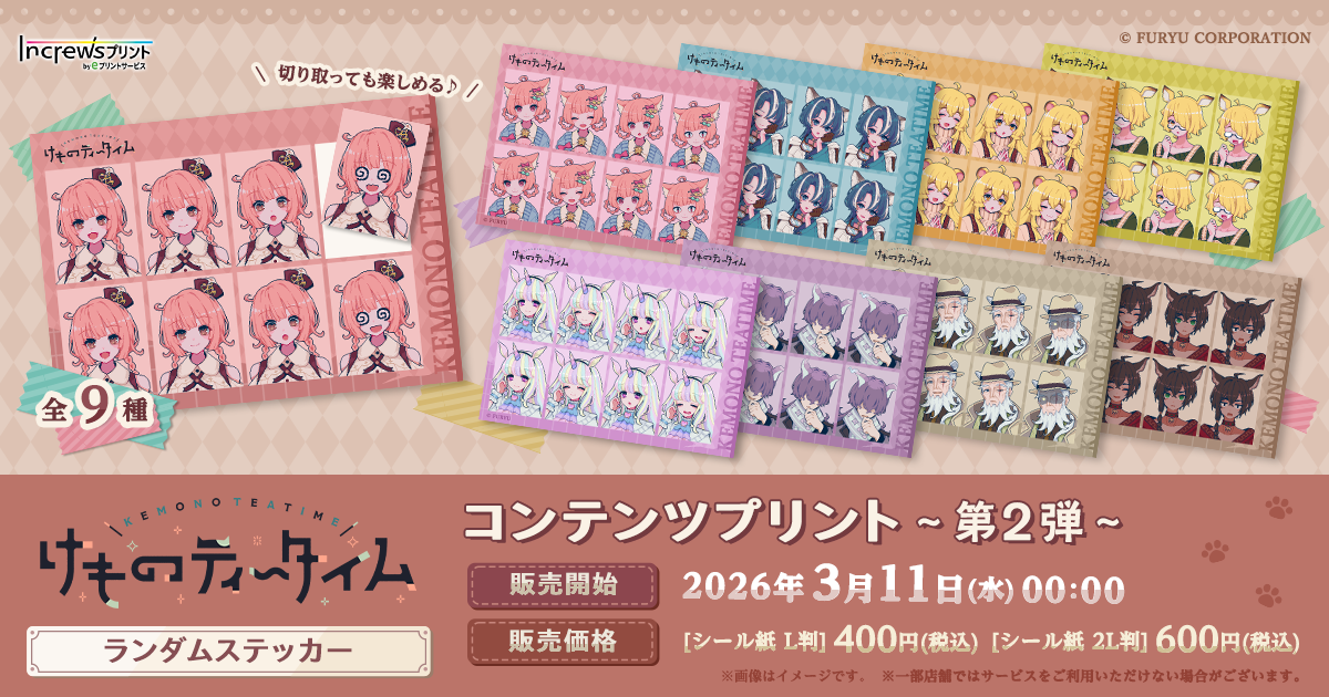 株式会社インクルーズ(東京都渋谷区、代表取締役社長 山﨑 健司)は、3月11日(水)より、日本全国のコンビニエンスストアを中心とするマルチコピー機内で気軽にプリントできる「インクルーズプリント by eプリントサービス」にて、『けものティータイム』のコンテンツプリント第2弾が選択式で開始したことをご報告させていただきます。