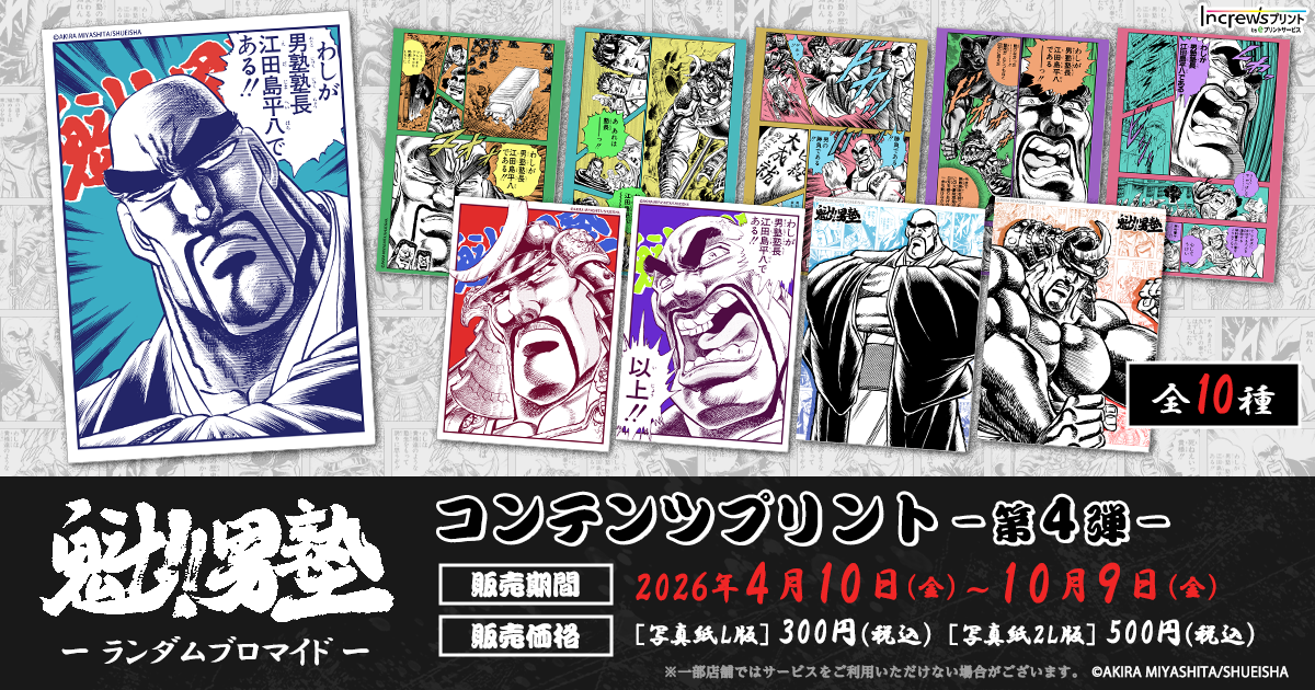 株式会社インクルーズ(東京都渋谷区、代表取締役社長 山﨑 健司)は、4月10日(金)より、日本全国のコンビニエンスストア店内のマルチコピー機を中心に、気軽にプリントできる「インクルーズプリント by eプリントサービス」にて、『魁!!男塾』のイラストを使用したランダムブロマイド第4弾が販売開始したことをご報告させていただきます。